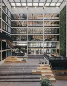Kommunikatives Herzstück des Neubaus ist das Atrium, das auch für Gäste öffentlich zugänglich ist. Eine offene Treppe windet sich spiralförmig um den zentralen Luftraum und verbindet alle Geschosse miteinander. Auf jeder Ebene entstehen an der Treppe terrassenförmige Plateaus. Der Neubau schreibt so die Gestaltung des umgebenden Platzes mit Treppen und Terrassen im Inneren fort. Im Erdgeschoss befinden sich Gastronomie- und Konferenzbereiche, in den Obergeschossen die mietbaren Büroflächen mit Zonen für kollaboratives und konzentriertes Arbeiten.