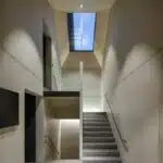 Der ebenerdige Veranstaltungsraum wurde in Anlehnung an traditionelle Weinfässer mit Fichtenholz ausgekleidet. So setzten die Architekten der harten Schale des Monoliths bewusst einen weichen Kern entgegen. Freien Einblick in den Raum gewährt eine großzügige Verglasung der Frontseite. Die dafür ausgewählte Glas-Faltwand aus der Solarlux-Serie Woodline nimmt den Holzton des Raumes auf und öffnet ihn barrierefrei auf einer Breite von über 7 m und einer Höhe von 3 m. Der Winzerkeller, der als Lager-, Schau- und Degustationsraum genutzt wird, liefert eine moderne Interpretation von historischen Gewölbedecken. Der abgeschliffene Betonboden ähnelt durch die Gesteinskörner den natürlichen Kiesböden früherer Weinkeller.