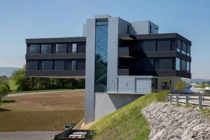Domico hat im oberösterreichischen Vöcklamarkt eine neue Firmenzentrale eröffnet, die auch als Kunden- und Kompetenzzentrum dient. Die Planung und Errichtung des siebengeschossigen Bauwerks erfolgte in Zusammenarbeit mit dem Architekten Volkmar Burgstaller. Bei den Materialien ist vieles aus eigener Herstellung, etwa eine besondere Deckenverkleidung, die sowohl Schall absorbiert als auch die Raumtemperatur regelt. Bei der Außenfassade stammen nur die Fensterelemente aus fremder Fertigung. Die 18 m freie Auskragung des ersten und zweiten Stockwerks soll dem Gebäude Leichtigkeit verleihen. Eine gläserne Treppe verbindet die Arbeitsbereiche transparent.