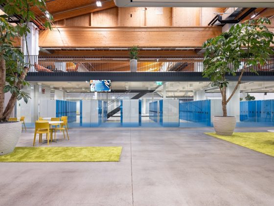Die sieben Meter hohe Halle verfügt über ein Holzdachtragwerk mit großen, südseitigen Sheds. Im Obergeschoss zoniert eine Versorgungs-Spine die Fläche. Von der Spine-Galerie gelangt man über Brücken zu den sogenannten Schiffen in Holzbauweise mit den Seminar- und Schulungsräumen. Hier schwebt man scheinbar über der Bürolandschaft des Erdgeschosses und blickt auf die entfernteren Hallenbereiche. Die Stahlstützen über dem Erdgeschoss werden von Decken aus Brettschichtholz ergänzt. ATP zeichnet sich für Architektur, Tragwerksplanung, HKLS, Elektro und Interieur im Hofer Alpha Retail Network verantwortlich.