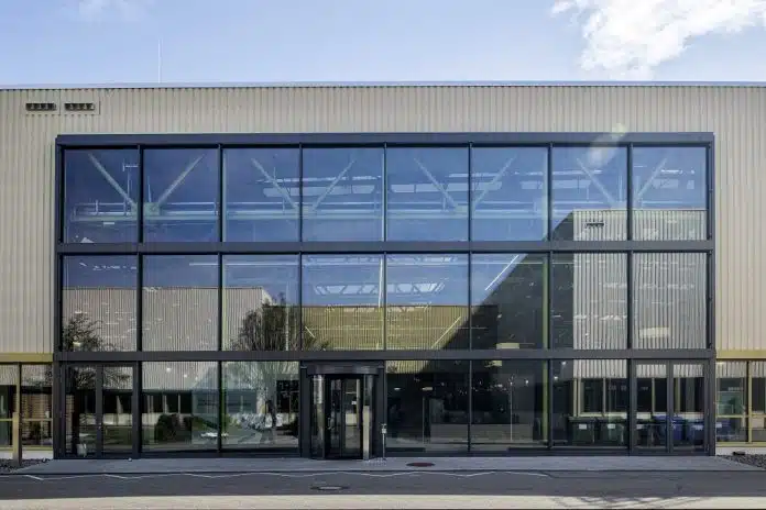 Damit die Arbeitsplätze mit ausreichend Licht versorgt werden, verfügt die ehemalige Produktionshalle nun über 7.000 m² Glas in der Gebäudehülle: als Oberlichter, Dachfenster sowie in der Fassade. Um die ursprüngliche Konstruktion der Halle beibehalten zu können, arbeitete der Bauherr bei der Planung und Installation der Fensterflächen mit Freyler Metallbau zusammen. Die Montage der Pfosten-Riegel-Fassade erfolgte parallel zum Innenausbau der Halle. Hinter die großen Fassadenflächen wurden zudem Heizungen auf Warmwasser-Basis installiert, um den Kaltluftabfall zu optimieren.