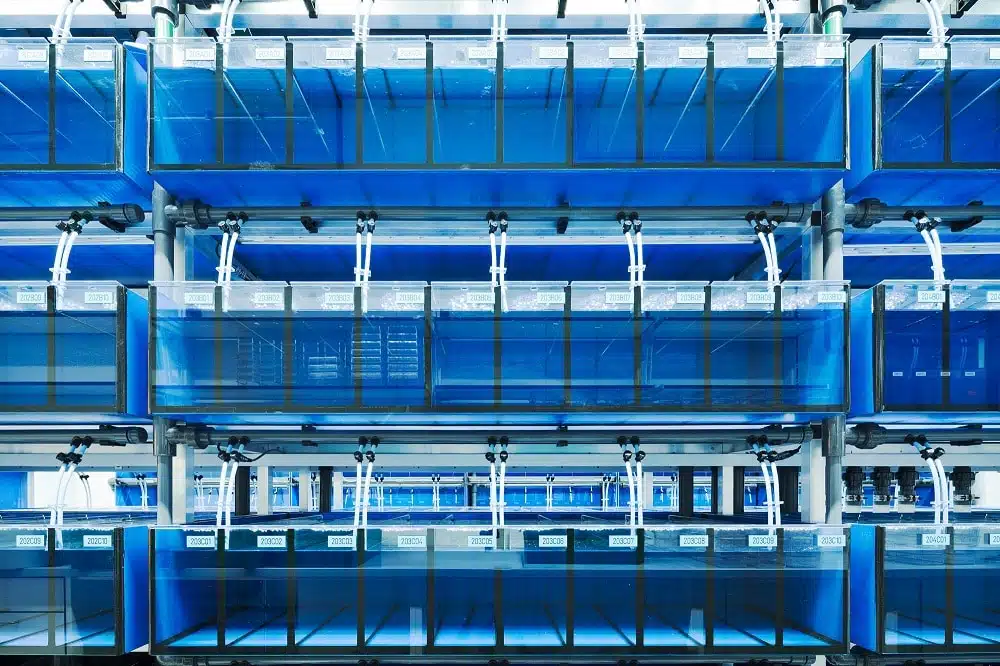 3.100 Aquarien für die schwimmenden Forschungsobjekte befinden sich im Untergeschoss des Gebäudes. Dazu wurden zwei voneinander getrennte Bereiche errichtet: ein hygienisch überwachter Quarantänebereich mit Personenschleuse, Fischhaltungsraum und Futteraufbereitungsstätte sowie die Hauptfischanlage mit vier separaten Fischräumen, Labor und Nebenräumen. Darüber hinaus verfügt der neue Forschungsbau über ein Kryolager mit flüssigem Stickstoff, wo das organische Material aufbewahrt wird.