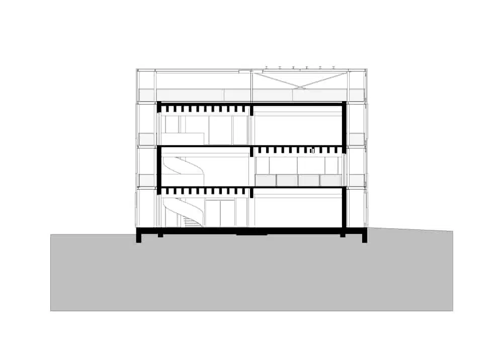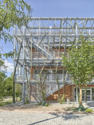 Auch bei der Fassadenverkleidung des Holzbaus konnte auf Restmaterial einer anderen Baustelle zurückgegriffen werden. Die Planer setzten den günstigen Verschnitt aus Kompaktlaminat wie Puzzleteile zusammen. Eine zentrale Rolle spielen die 60 Jahre alten Hochspannungs-Gittermasten, die der Netzbetreiber Swissgrid als Schrottmaterial anbot. Sie bilden die stählerne Gitterstruktur der Laubengänge und umhüllen den Kubus aus Holz. Da die Baubestimmung eine tragende Funktion der gebrauchten Masten nicht zuließen, bilden sie nun das Rankgerüst für Kletterpflanzen und dienen so zugleich der Verschattung.