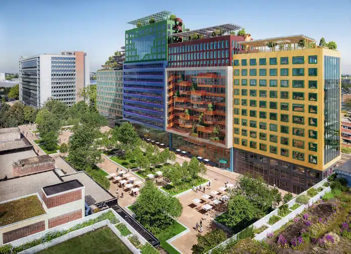 Auf einem schmalen Grundstück neben der Bahnlinie im Gebiet Schiekadeblok in Rotterdam wird mit einem imposanten Bauwerk eine Lücke geschlossen. Der für LSI von MVRDV entworfene, 47.000 m2 große Büro- und Gewerbekomplex Schieblocks hat Anfang Dezember 2025 die Baugenehmigung erhalten. Inspiriert von Donald Judds farbenfroher Möbelserie kombiniert jeder Block ein Fenstermuster und eine Farbe, die von den historischen Gebäuden Rotterdams inspiriert sind. So weist beispielsweise ein Block Erkerfenster auf, die an das von Huig Maaskant entworfene Citrusveiling-Gebäude im Westen Rotterdams erinnern, kombiniert mit dem leuchtenden Gelb der benachbarten Luchtsingel-Brücke. Ein anderer Block vereint die Sandsteinfarbe des Rotterdamer Rathauses mit Fenstern, die an die Fassade des Office-Gebäudes Hofplein 19 erinnert.