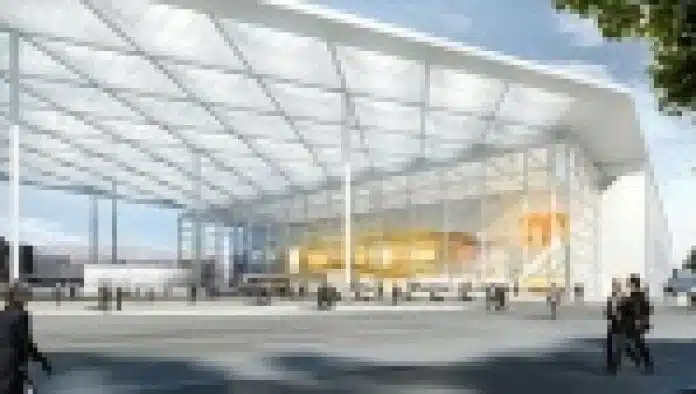 Seit dem Jahr 2000 modernisiert die Messe Düsseldorf ihr Gelände, um den Messeplatz für Aussteller, Messebesucher und Kongressteilnehmer attraktiv zu halten. Für die Planung der Neuen Messe Süd ging der Auftrag an Slapa Oberholz Pszczulny architekten (sop), die neben dem Neubau der Messehalle 1 auch einen Konferenzbereich sowie den neuen Südeingang mit repräsentativem Messevorplatz konzipierten. Kernelement des Entwurfs ist ein überdimensionales, 7.800 m² großes Vordach aus transluzentem Glasfasergewebe, das den neuen Eingang markiert. Gleichzeitig vereint das 20 m hohe Dach alle Funktionen unter sich, vom Messevorplatz über das lichtdurchflutete Foyer bis zur neuen Messehalle, und integriert das benachbarte Congress Center Düsseldorf (CCD) Süd. So schaffen die Planer einen sensiblen Übergang zur bestehenden Architektur. Die polygonale Form des 170 m langen und bis zu 93 m breiten Vordachs definiert sich durch das dreieckige Messegrundstück und erzeugt einen dynamischen, Körper.