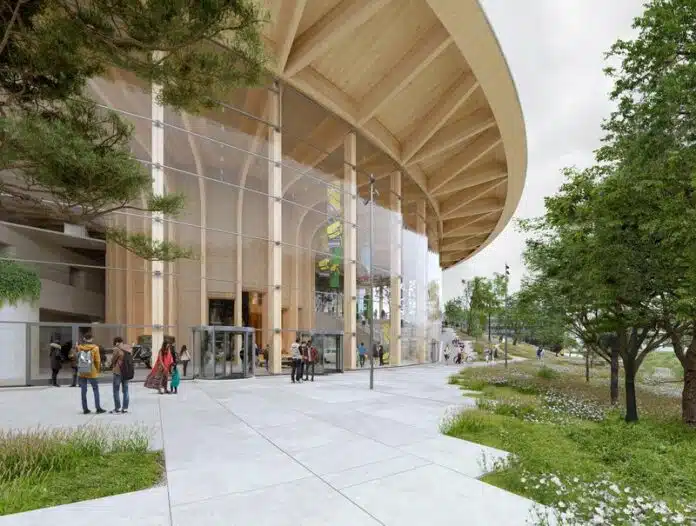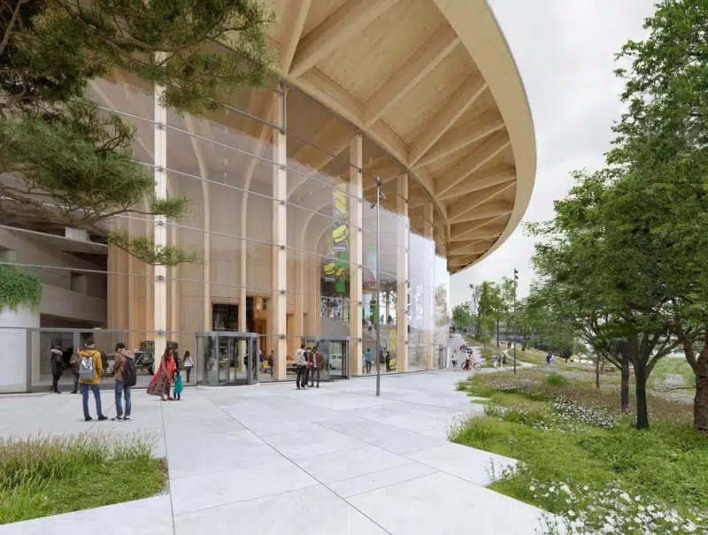 Die Holzstruktur ist bereits fertiggestellt. Anlass genug für Henning Larsen, das Design für die „World of Volvo“ in Göteborg öffentlich zu präsentieren. Das dänische Architekturbüro hat 2018 den Wettbewerb um das Erlebniszentrum der schwedischen Marken Volvo Cars und Volvo Group für sich entschieden. Der Entwurf für das 22.000 m² große kreisförmig angelegte Bauwerk legt seinen Fokus auf die skandinavische Landschaft, auf Umwelt und Tradition. Dabei stellen die Planer das Grundrecht aller Bürger auf die Teilhabe an der Natur und die Rücksicht darauf in den Vordergrund. „Allemansrätten“ wird dieses Prinzip genannt, das zentraler Bestandteil des schwedischen Ethos geworden ist. Die Besucher sollen das Haus Schritt für Schritt erfahren können, dort Ausstellungen, Vorträge, Konferenzen oder Musik erleben, essen, trinken und einkaufen können.