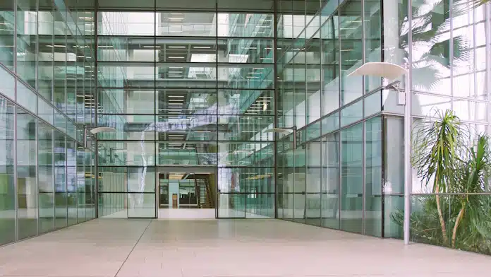 Exterior Of Modern Glass Office Building Showing Lobby And Staircases