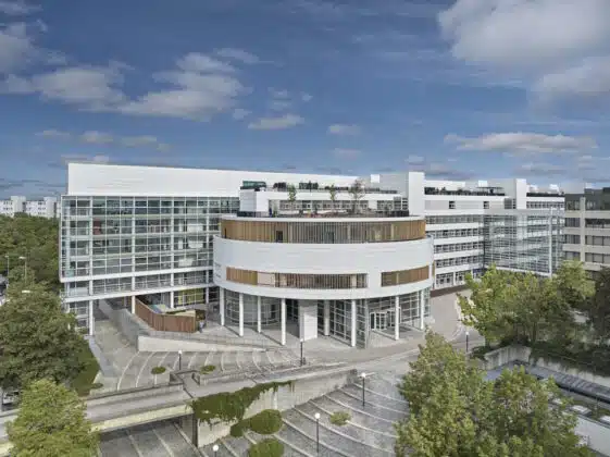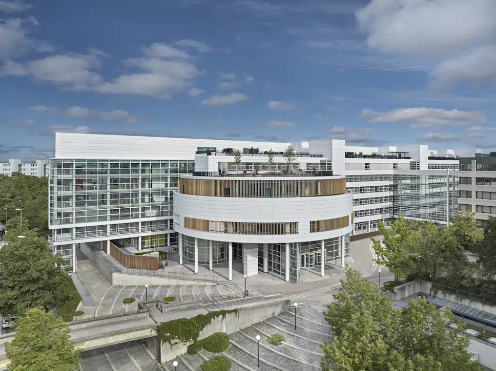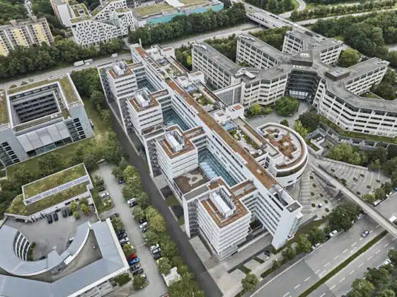 Neuperlach – von den Münchnern geschätzt und geschmäht zugleich – erlebt als Satelliten-Stadt vom Reißbrett eine Renaissance. Auslöser des Revivals ist neben dem drängenden Wohnraummangel die Erkenntnis, insbesondere der Investoren, welche Vorteile dieser Standort bietet. Beste Anbindung an die Berge, nahe an der City, moderne Infrastruktur und – viel freie grüne Flächen zwischen den Gebäuden. Etwas Vergleichbares gäbe es in München nicht, ist auf der Website des Immobilieninvestors Hines zu lesen. Diese Qualität wird nun wiederentdeckt und genutzt. Während die Grünflächen des Quartiers erhalten bleiben sollen, plant man innerhalb des Fußabdrucks der Gebäude in die Höhe und nutzt Flächenreserven. Prominentes Beispiel für die Bestrebungen zur Nachverdichtung ist das ehemalige Verwaltungsgebäude der Allianz-Versicherung. Es hebt sich mit seiner zeitlosen Architektur und den leuchtend weißen Fassaden von gewöhnlichen Büroimmobilien ab: Der Gesamtkomplex mit seinem lang gestreckten und mit Glas gedeckten Hauptbaukörper ist typisch für die großzügige Architektur der 1990er-Jahre und nimmt unverkennbar Anleihen an die ikonenhaften Entwürfe des amerikanischen Architekten Richard Meier. Die Inspiration kommt dabei nicht von ungefähr. Das ursprünglich nur für einen Nutzer konzipierte, repräsentative Gebäude wurde 1996 von Lauber + Wöhr Architekten entworfen, die Schüler des New Yorker Stararchitekten waren. Allerdings entsprach das weitläufige Ensemble nicht mehr den heutigen Anforderungen an Wirtschaftlichkeit, Flexibilität und eine moderne Arbeitswelt.