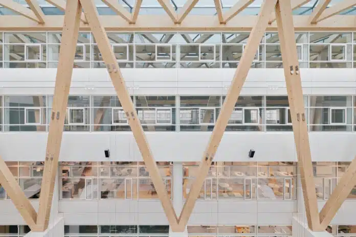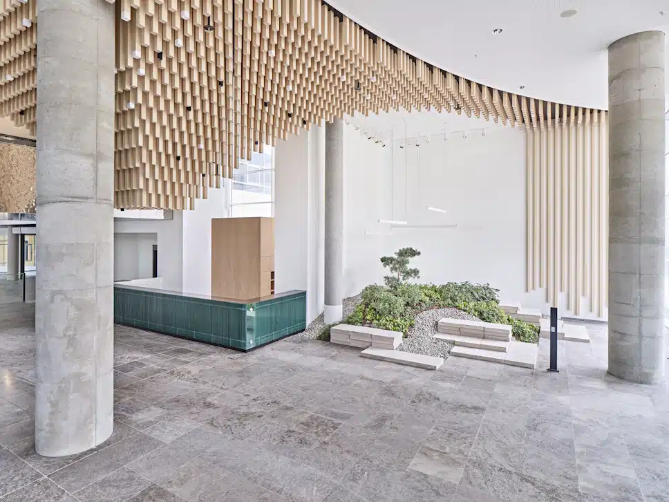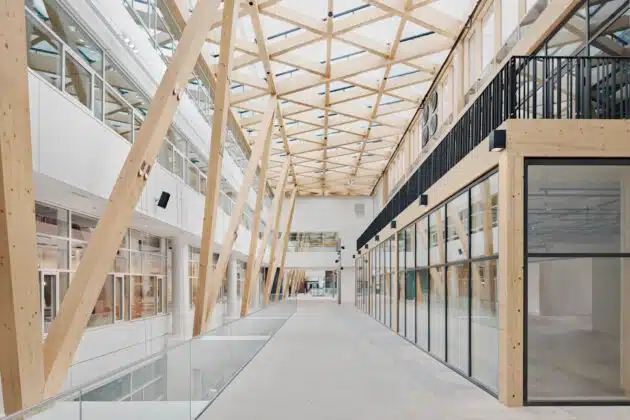 Mit der umfassenden Revitalisierung des einstigen Allianz-Standorts in Neuperlach soll nun „eine maximale Wertschöpfung“ erreicht werden. Was zunächst nüchtern und seelenlos klingt, erweist sich bei genauerer Betrachtung als das Gegenteil. Thomas Sutor und das Team um den Projektleiter Marcus Beuerlein von Oliv Architekten haben mit dem Hinzufügen und Verdichten eine neue Qualität in dem ursprünglich kühlen und distanzierten Bau geschaffen. Bislang ungenutzte (Frei-)Räume werden zu kommunikativen Begegnungsflächen. Der Einsatz von Holz schafft eine wohnliche, ja menschliche Atmosphäre, die dem Haus vorher gefehlt hat. Zugleich hat die komplette Neuorganisation des Gebäudes bewirkt, dass die Nutzbarkeit und Wirtschaftlichkeit deutlich verbessert wurden. Durch eine signifikante Flächenmehrung entstand eine vielseitige Immobilie, sowohl für einen einzelnen Mieter als auch für verschiedene Nutzer. Der Fokus der Planung lag auf intelligenten Haustechniklösungen, grüner Infrastruktur und dem Einsatz verschiedener Holzkonstruktionen, um den CO2-Fußabdruck zu minimieren – und gleichzeitig den Anforderungen an einen zukunftsfähigen ESG-konformen Standort gerecht zu werden. Dabei bewahrt das Sanierungskonzept die charakteristische Architektur, entwickelt sie aber in neuen, nachhaltigen und innovativen Bereichen weiter.